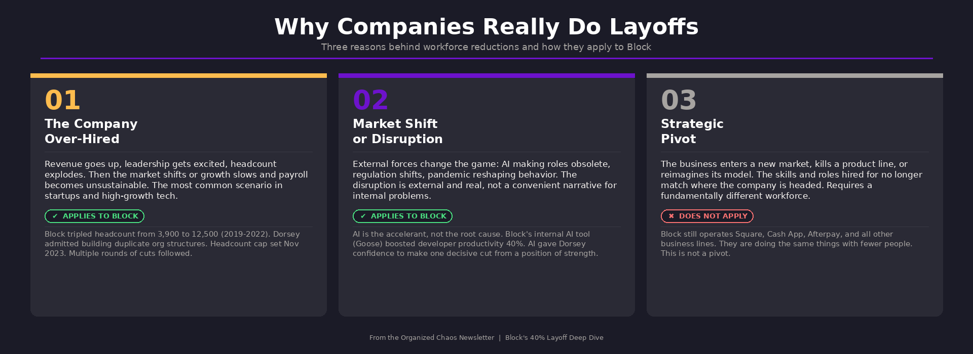 Everyone Is Blaming AI for Block's 40% Layoff. The Data Tells a Different Story.I'm sure you've heard this news by now. Jack Dorsey cut more than 4,000 employees from Block, taking the company from over 10,000 people to just under 6,000. I wasn't planning on writing about this, but the conversation on LinkedIn and elsewhere has been dominated by fear, hot takes, and very little actual analysis. So I decided to dig into the data and share what I found, because the story the numbers tell is very different from what's being reported. Pinning this squarely on AI is lazy analysis that misses the real lessons for startup founders and HR leaders. And those lessons matter because the decisions you make about headcount during growth will determine whether your company survives its next downturn. Let me walk you through what actually happened, why companies really do layoffs, and what this means for you. Why Companies Actually Do LayoffsBefore we dig into Block specifically, let's establish a framework. In my experience working with startups, layoffs generally happen when one or more of the following are true. The company over-hired and revenues didn't catch up to the increase in costs. This is the most common scenario, especially in the startup world. Revenue goes up, the leadership team gets excited, headcount explodes, and then the market shifts or growth slows. Suddenly you've got a payroll that your revenue can't support. This is exactly what I wrote about in my episode on workforce planning, where I talked about the e-commerce company that wanted to increase headcount by 50% to support forecasted growth. I recommended approving only 3 out of 45 hire requests. When revenue dropped 25% shortly after, we didn't lay off a single person because we hadn't made those unnecessary hires in the first place. There is a market shift or disruption happening due to technological, political, environmental, or other reasons. This is when external forces change the game. Maybe AI is genuinely making certain roles obsolete. Maybe regulation changes your business model. Maybe a pandemic reshapes consumer behavior. The key difference here is that the disruption is external and real, not a convenient narrative to dress up internal problems. The business has decided to pivot into something fundamentally different and the current headcount is no longer fit for purpose. This happens when a company decides to enter a new market, kill a product line, or completely reimagine its business model. The skills and roles you hired for no longer match where you're going. With that framework in mind, Block's situation maps clearly to the first two reasons. Let's look at what actually happened. The Overhiring Problem That Nobody Wants to Talk AboutBlock tripled its headcount from 3,900 to 12,500 between December 2019 and December 2022. Let me say that again. They went from roughly 4,000 people to over 12,000 in three years. Dorsey himself admitted on X that he made a structural mistake during this period by building two separate company structures for Square and Cash App instead of one integrated organization. That's not an AI problem. That's an organizational design problem that he didn't fix until mid-2024. On top of that, Block added significant operational complexity during this time by expanding into lending, banking, and buy-now-pay-later services. Each of those businesses requires compliance infrastructure, specialized teams, and management layers. More people, more complexity, more cost. And here's the part that really tells the story. Gross profit per employee stayed flat at roughly $500,000 from 2019 through 2024, despite all that hiring. They tripled their headcount but didn't meaningfully increase how much value each employee was generating. That is the textbook definition of bloat. The company recognized this well before the AI narrative took hold. In November 2023, Block set a headcount cap of 12,000 employees. Throughout 2024, they stayed under that cap through performance management, centralizing teams to reduce duplication, and narrowing their scope. They cut roughly 8% of the workforce in 2023 and another 8% in early 2025. This has been an unwinding in progress for over two years. The Financial Performance Tells a Different Story Than the HeadlinesIf you only read the headlines, you'd think Block was in trouble and AI was their lifeline. The exact opposite is true. This is a company operating from a position of strength. Q4 2025 gross profit was $2.87 billion, up 24% year over year. Adjusted operating income grew 30% in 2025 with 2 points of margin expansion. Full-year 2025 gross profit hit $10.36 billion, up 17% year over year. Cash App gross profit surged 33% in Q4 alone. They're guiding $12.2 billion in gross profit for 2026 with adjusted operating income expected to grow 54%. These are not the numbers of a company that needs to cut 40% of its workforce to survive. These are the numbers of a company that has been carrying unnecessary headcount for years and finally decided to address it all at once. The stock popped roughly 25% after the announcement. And while the AI narrative made for a great story, markets reward efficiency and cost reduction regardless of the stated reason. If Dorsey had said "we overhired for three years and we're fixing it," the stock still would have gone up. AI Is the Accelerant, Not the CauseNow let me be clear. I am not saying AI has nothing to do with this. It absolutely does. But its role is that of an accelerant, not the root cause. Block has been embedding AI across its operations for over 18 months through its internal tool called Goose, which sits on top of large language models to automate workflows and developer tasks. Since September 2025, the company has seen a 40% increase in developer productivity from AI tools. That's real. That matters. What AI did here was give Dorsey the confidence and the operational model to make one decisive cut instead of continuing the slow b