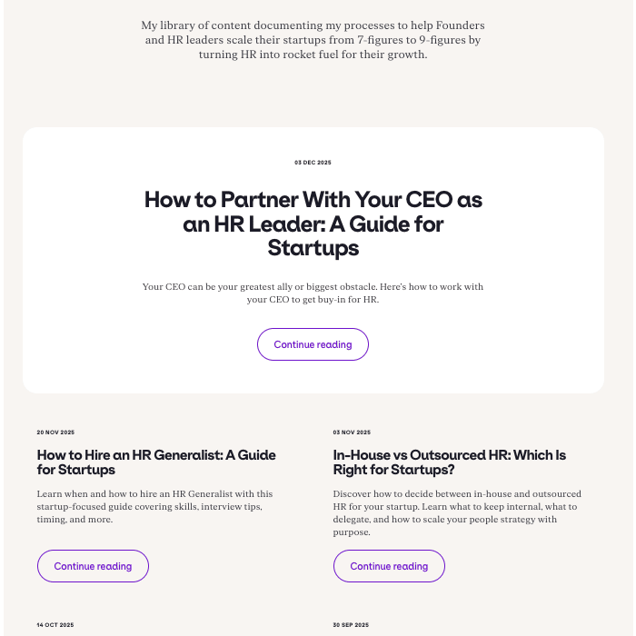 The best startup HR advice comes from people who have actually built HR functions from zero at fast-growing companies. Not from people who inherited a 200-person HR department and optimized it. When you're evaluating advice from a blog, a podcast, a consultant, or a peer, ask one question: Has this person done what I'm trying to do, in a context like mine? If the answer is no, take their advice with skepticism. Know a founder who is drowning in enterprise HR advice that doesn't fit their startup? Forward this to them. |